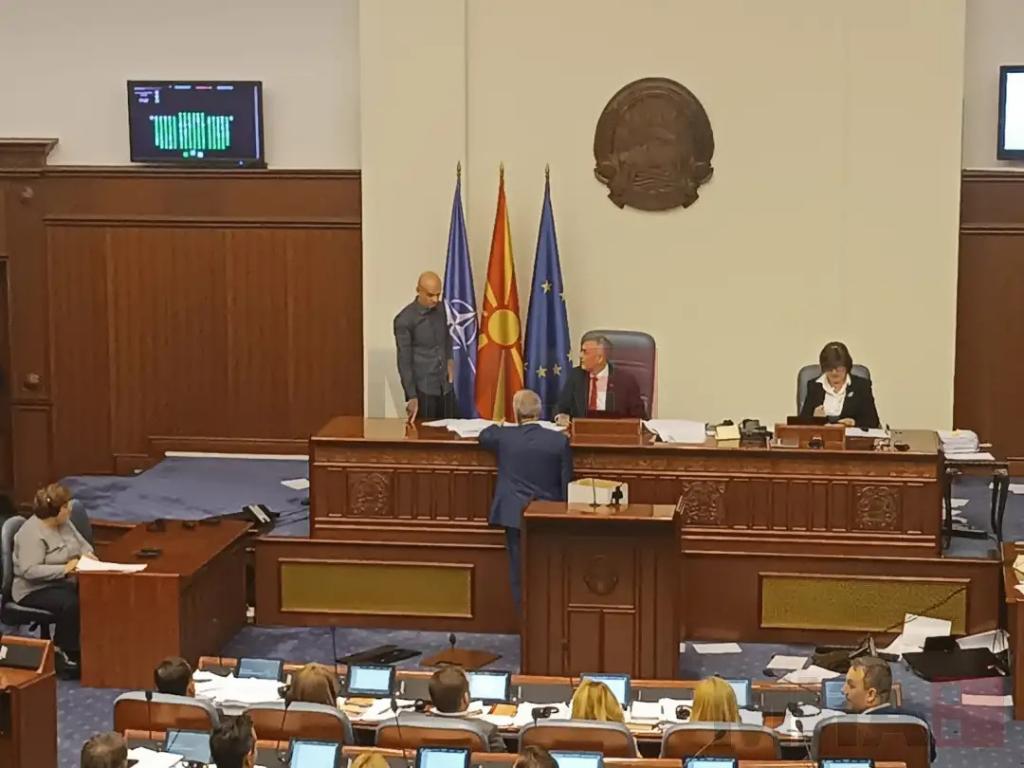 Претходно седницата исто така беше прекината откако пратениците од Левица постојано бараа седницата да не се одржува, се расфрлаа со листови со амандамните за Предлог Деловникот на Собранието и посегаа по дел од преостанатиот инвентар од претседавачката маса.