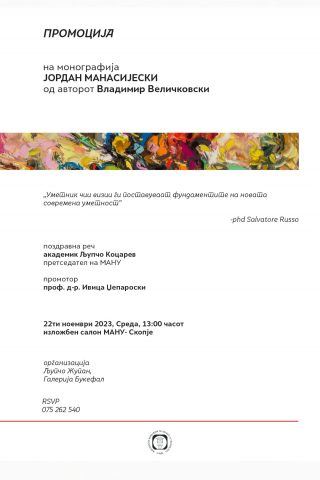Неодамна излезе од печат Монографијата посветена на големиот македонски уметник Јордан Манасијески од Охрид, чиј автор е проф. д-р Владимир Величковски.