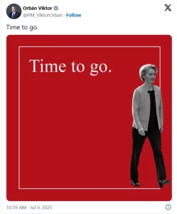 Орбан го објави тоа на социјалната мрежа X со фотографија стилизирана како насловна страница на списанието „Тајм“, посветена на повлекувањето на поранешниот американски претседател Џо Бајден од изборната трка во 2024 година, со слика од Фон дер Лајен и текст „Време е да си одиме“.