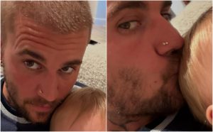 На првата фотографија, Џастин, кој го има својот единствен син со сопругата Хејли, изгледа изненадено додека малечкиот Џек со кренати нозе делумно ја прекрива камерата. На другите две фотографии, лицето на бебето не се гледа, но во преден план е топлиот момент – пејачот го бакнува синот по тилот и го држи цврсто во прегратка, откривајќи ги неговите долги златни кадрици, слични на оние што самиот ги носеше на почетокот од својата кариера.