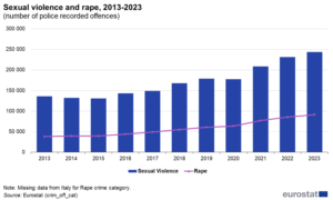 На ниво на Европската Унија, податоците на Евростат јасно покажуваат пораст на пријавените злосторства од сексуално насилство. Бројот на пријавени силувања е повеќе од двојно зголемен од 2013 година, забележувајќи зголемување од 141%.