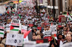 На протестот „Стоп на геноцидот во Газа“, демонстрантите го осудија нападот на Хамас на 7 октомври 2023 година, но нагласија дека израелскиот одговор „ги надминува границите на човештвото“, објавува Дојчландфунк.