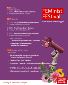 За првпат во Скопје ќе се одржи регионалниот феминистички фестивал „Еден свет, една борба“, од 19 до 21 октомври 2025 година. Овој фестивал претставува уникатна платформа за уметничко и општествено изразување, преку која регионални и европски уметници ќе говорат за најзначајните теми на нашето време, а тоа се родова еднаквост, феминизам, солидарност и социјална правда, најавуваатод Фондацијата „Фридрих Еберт“ .