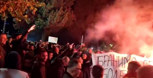 Толпата скандирала „Турците надвор“ и „Кој не е со нас е Турчин“, а се слушаат и слогани против српскиот претседател Александар Вучиќ.