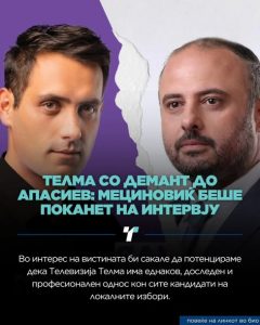 Во интерес на вистината би сакале да потенцираме дека Телевизија Телма има еднаков, доследен и професионален однос кон сите кандидати на локалните избори. Оваа наша реакција доаѓа по вечерашната објава на личниот ФБ профил на лидерот на Левица Димитар Апасиев. Тој ја обвини Телма дека не му дозволила на кандидатот за градоначалник Амар Мециновиќ да се појави на интервју на Телма, откако против кандидатот Орце Ѓорѓиевски ја одби поканата за дебата.