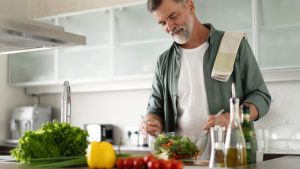Храната е локално произведена, минимално преработена и главно зеленчук, овошје, мешункасти растенија и цели зрна, со умерена потрошувачка на риба или месо. Маслиновото масло е главен извор на масти, кои обезбедуваат здрави за срцето мононезаситени масти. Медитеранската исхрана е поврзана со намален ризик од хронични болести, вклучувајќи срцеви заболувања, како и дијабетес, и го поддржува целокупното здравје со стареењето.