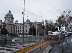 Пред српскиот парламент утрово е сè уште мирно, а сообраќајот на раскрсницата Таковска, Кнежа Милоша и Булевар крал Александра, кој во изминатите денови повремено беше блокиран од групи граѓани, се одвива нормално.