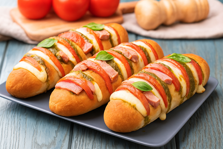 - Вметнете парче домат, парче шунка и парче сирење во секој слот.