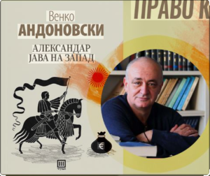 „Чекајќи роман“, по точно три години од големиот книжевен спектакл што го одбележа пристигнувањето на „Папокот на светлината“ во Кино „Милениум“, и по големиот успех на оваа книга што досега доби 6 изданија и меѓународната Толстоева награда „Јасна Полјана“, Венко Андоновски се врати на книжевната сцена со фасцинантна фарса и ведра гротеска напишана со брутална смелост „Александар јава на запад“, во издание на „ТРИ“.
