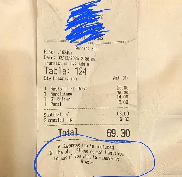 Австралиски пар беше непријатно изненаден по ручекот во италијански ресторан во Сиднеј кога забележаа автоматски додаден бакшиш на сметката. Иако постоеше можност да се одбие, мораа експлицитно да го замолат персоналот да го сторат тоа, што предизвика жестока дебата на интернет, пишува Daily Mail.