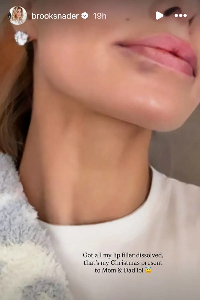 Моделот Брукс Надер, позната по својата искреност за естетските процедури, реши да влезе во новата година со поприроден изглед. Ги отстрани филерите од усните и со хумор ја нарече целата процедура “божиќен подарок за мама и тато.” 28-годишната ѕвезда на Sports Illustrated Swimsuit и поранешна учесничка во Dancing with the Stars повторно јавно зборуваше за своите одлуки поврзани со изгледот.