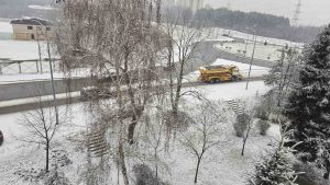 Поради мраз и снег на коловозите во град Скопје, зимската служба е ангажирана со целосна механизација и континуирано врши чистење и посолување на сообраќајниците.