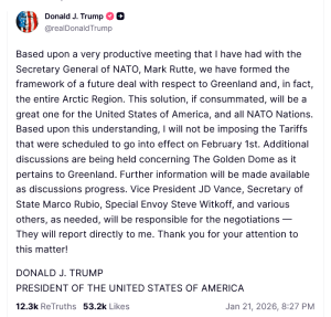 Трамп го објави договорот на социјалната мрежа Truth Social по средбата со генералниот секретар на НАТО, Марк Руте, во Давос, каде што се одржуваше Светскиот економски форум. Тој напиша дека тој и Руте „формирале рамка за иден договор во врска со Гренланд и, всушност, целиот арктички регион“, без да даде детали. Додаде дека таквото решение, доколку се реализира, би било „одлично за Соединетите Американски Држави и сите земји од НАТО“.