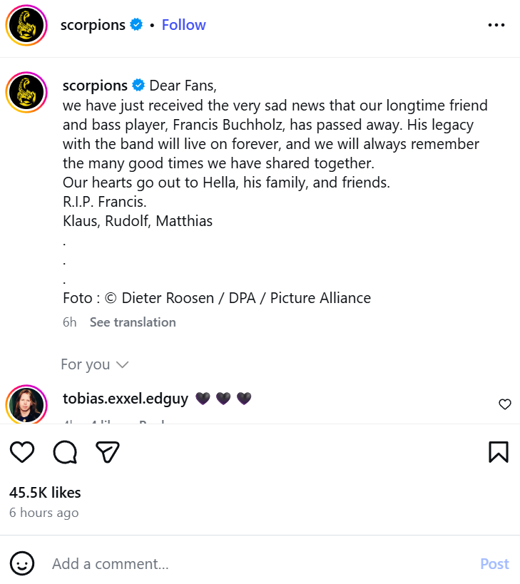 Членовите на „Скорпионс“ исто така се збогуваа со својот поранешен колега на својот Инстаграм профил, опишувајќи го како „долгогодишен пријател“. „Неговото наследство во бендот ќе живее засекогаш, а ние секогаш ќе го паметиме по многуте убави моменти што ги споделивме“, се вели во објавата.