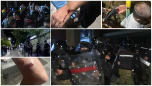 Полицијата ја турна толпата од платото и формираше формација за да не дозволи никој да се приближи до зградата. Обрачот се шири за да никој не може да стигне до зградата на факултетот каде што деканот и неколку колеги престојуваат од вчера наутро.Во еден момент, некој извика „внимавајте на грбот“, граѓаните ги држеа рацете во воздух додека полицијата минуваше. На членовите на Интервентната единица им се придружи и жандармеријата, кон која беа фрлани разни предмети од толпата. Ги опколија граѓаните од сите страни, а во еден момент започна стампедо. На граѓаните им беше кажано да се оддалечат од Филозофско, додека на новинарите им беше дозволено да поминат, јавува репортер на N1. Еден од ветераните кој имаше рана на носот изјави дека бил удрен со полициски штит.